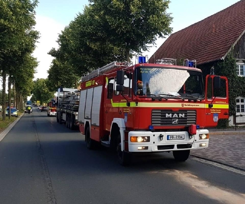 Noch vor dem Abrücken von der vorherigen Einsatzstelle in Ebbinghausen erfolgte die Alarmierung nach Lichtenau. Hier verlor ein LKW aufgrund eines technischen Defektes Diesel. Der Löschzug fing auslaufenden Kraftstoff auf und streute die Dieselspur durch den Ort ab. Mithilfe einer Kehrmaschine wurde das Bindemittel aufgenommen.